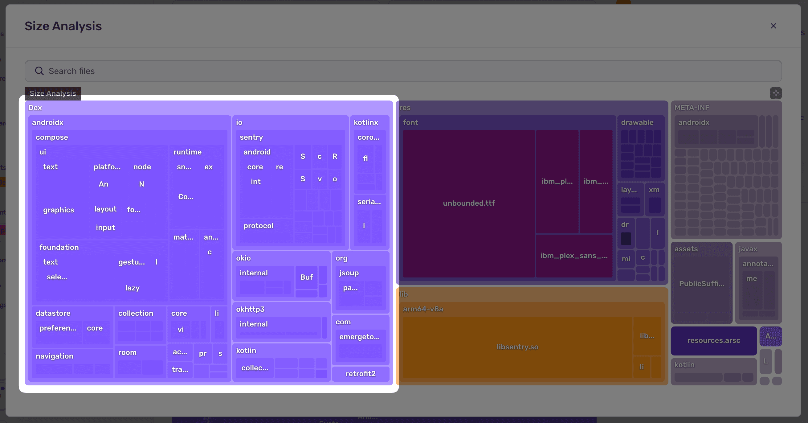 In order to create the size tree map we parse the customers app and extract a hierarchy of named weighted nodes. For Android these nodes include JVM classes: